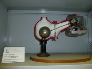 Il regolatore di livello della foto (sezionato per evidenziare il galeggiante e il dispositivo di contatto), è così formato a scopo chiaramente didattico. L’originale era impiegato nelle caldaie e il galleggiante è mosso dal livello dell’acqua; quando il galleggiante si alza, appunto per effetto dell’acqua che sale, un’asta meccanica collegata a una leva muove un contatto, che a sua volta apre o chiude un circuito elettrico ad esempio per bloccare la motopompa che invia l’acqua. Nel caso specifico il contatto è sostituito da due terminali che fanno capo a un’ampolla contenente del mercurio che, come noto, è un ottimo conduttore. L’inclinazione dell’ampolla collegata all’asta del galleggiante fa si che il mercurio si sposti toccando o meno i terminali chiudendo o aprendo un circuito in modo analogo a un contatto elettrico.